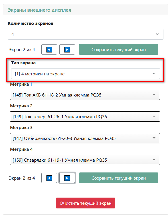 Если какой либо экран недонастроен, те не выбран корректно метрики, то такие поля буду выделены красной рамкой и кнопка Сохранить экран будет недоступна, нужно исправить ошибки , что бы красная рамка исчезла.