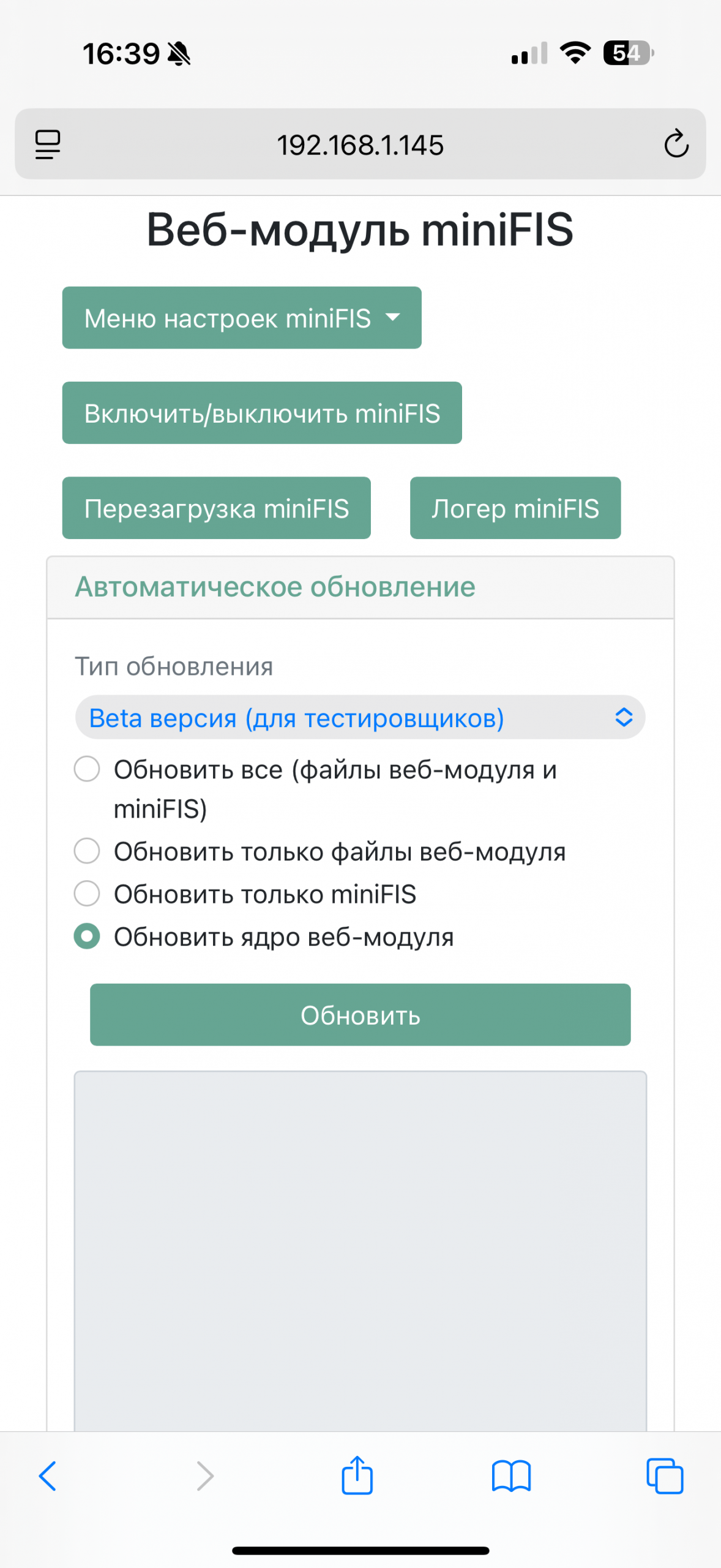 - Все, можно пользоваться обновленной версией. Далее нужно обновить сам miniFIS: в разделе Обновление выбрать Автоматическое обновление — Обновить только miniFIS — версия Бета — жмем Обновить и ждем окончания обновления, около 5 минут. После можно пользоваться обновленным miniFIS.