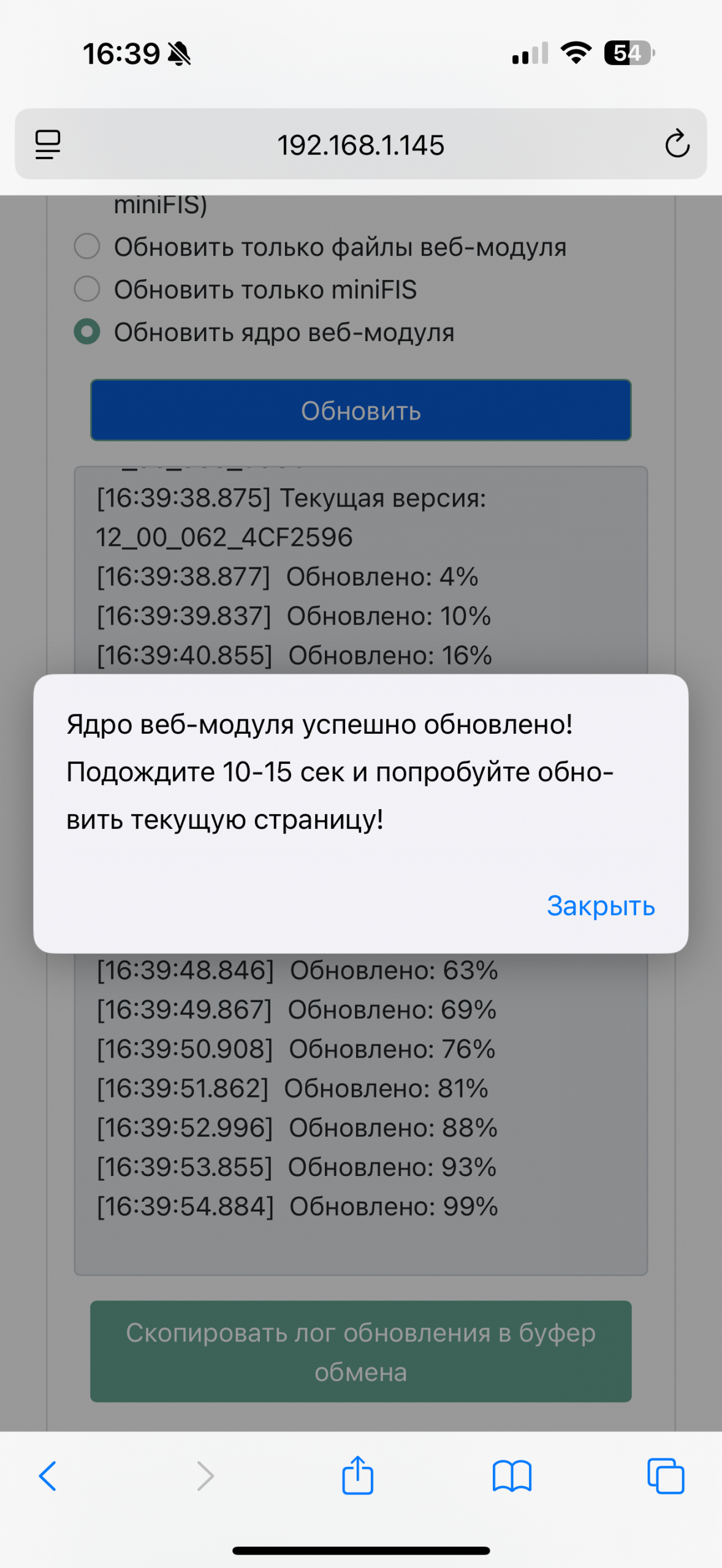 - Как прошивка обновится, будет сообщение, нажимаем в нем ОК и ждем 10-15 сек (вебмодуль перезагружается и переподключается.):