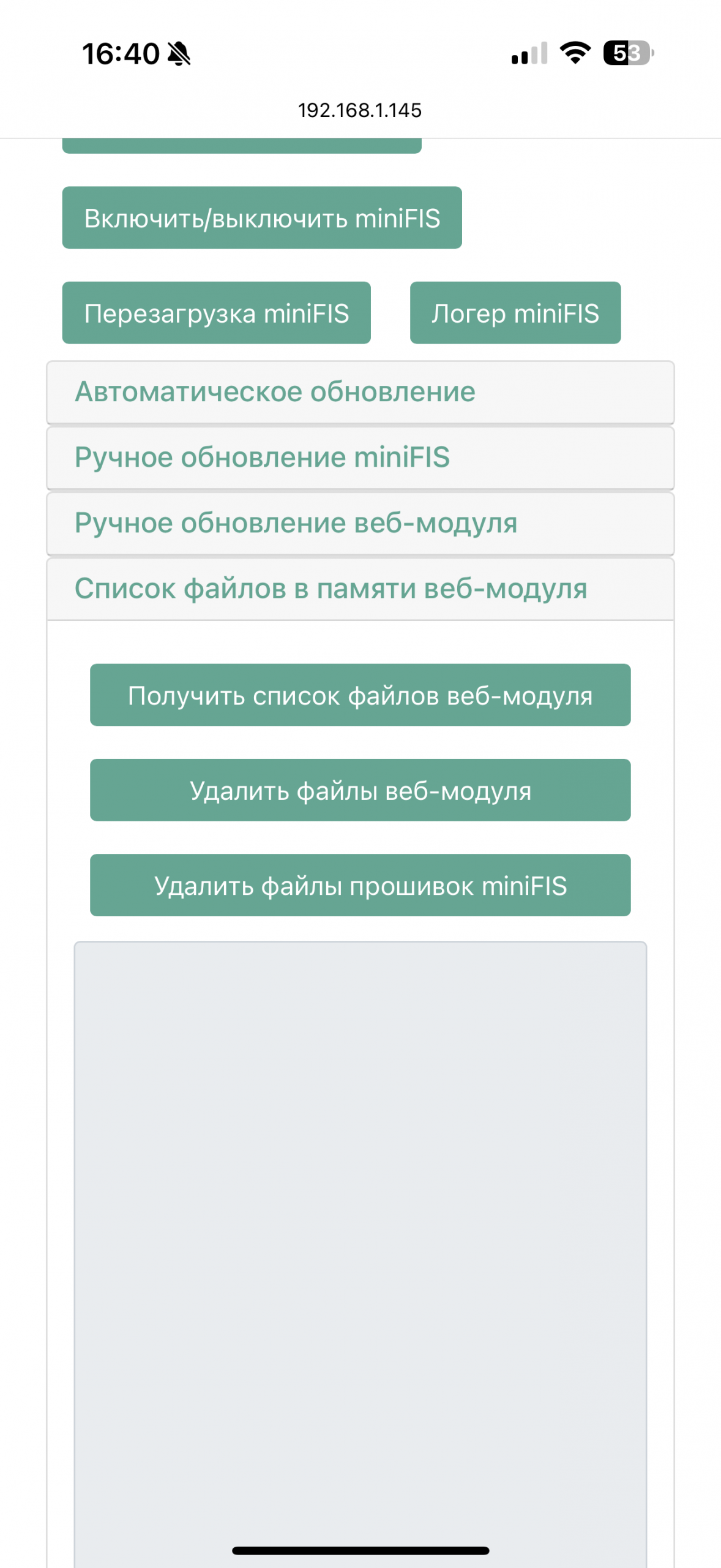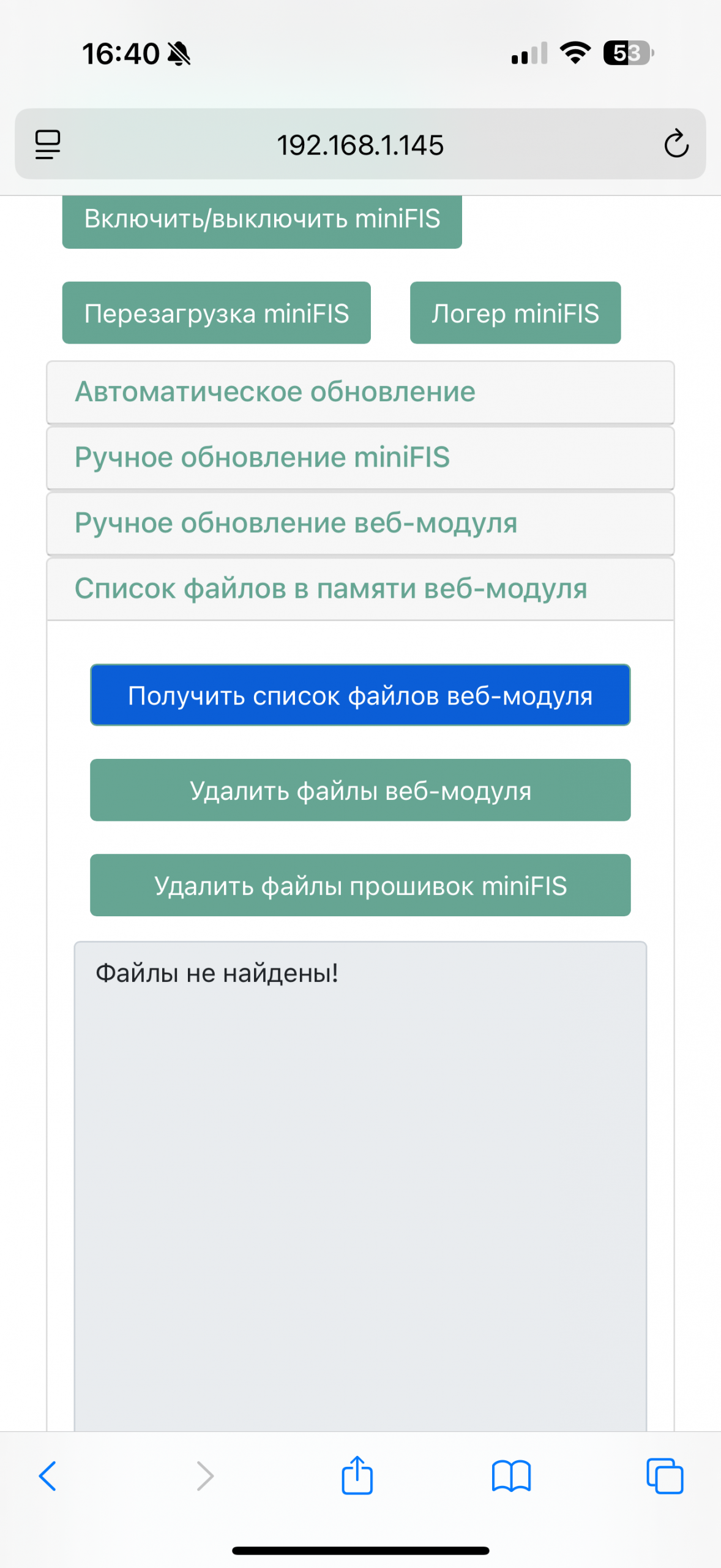 - Нажимаем сначала кнопку Удалить файлы веб-модуля, потом Удалить файлы прошивок miniFIS, после нажимаем Получить список файлов веб-модуля, в поле ниже должно быть написано: Файлы не найдены: