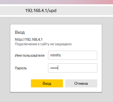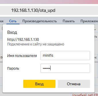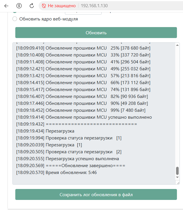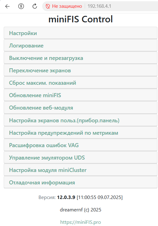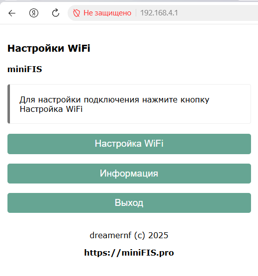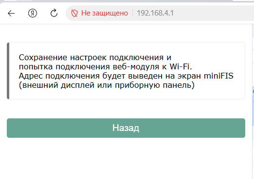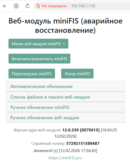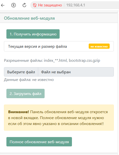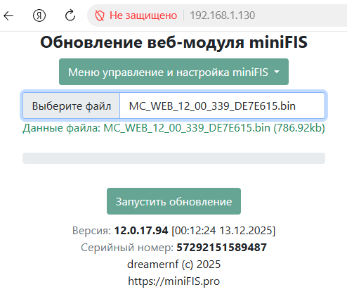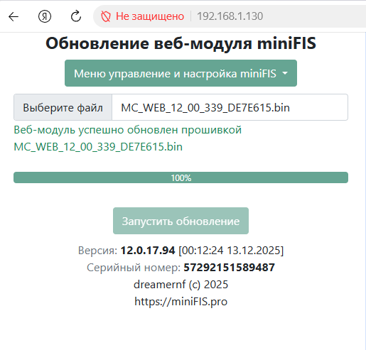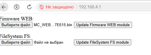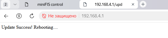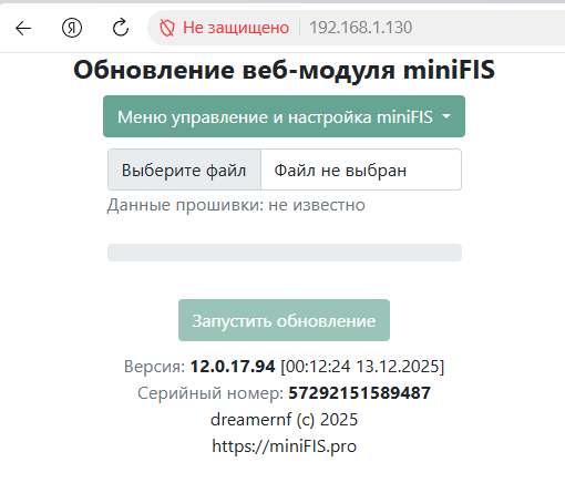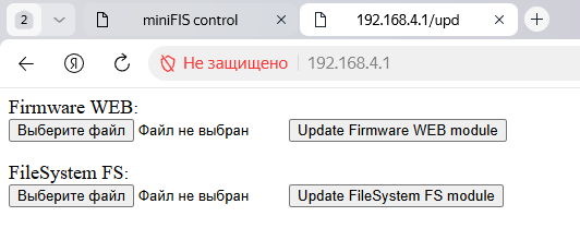 Перед обновлением, нужно выполнить обновление miniFIS до новой версии прошивками (2 файла) (в этой версии реализован вывод адрес подключения к веб-модулю, без него вы не сможете попасть в настройки), как обновлять описано тут —Обновление прошивки веб-модуля miniFIS