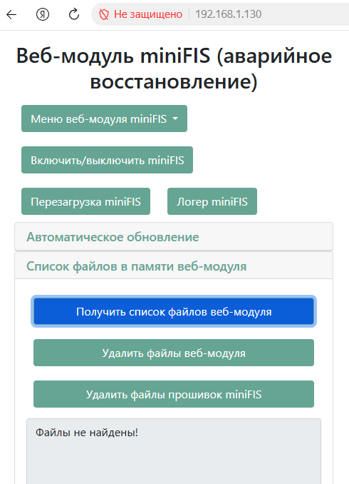 Идем в раздел Список файлов веб-модуля-> Получить список файлов веб-модуля, должно быть написано Файлы не найдены. Если в списке будут файлы — Нажимаем удалить файлы веб-модуля и Удалить файлы прошивок miniFIS
