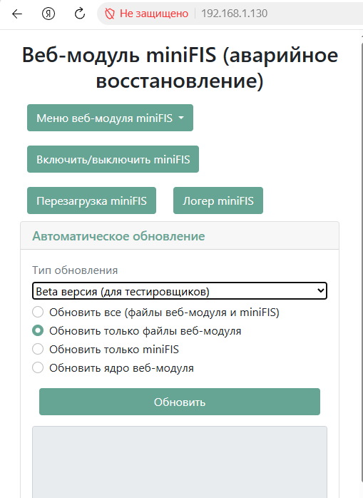 Пробуем обновить сам miniFIS. Идем в раздел Автоматическое обновление -> Обновить miniFIS, тип обновления Beta:
