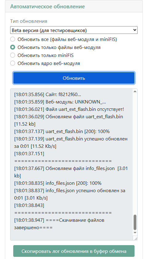 Далее идем в Автоматическое обновление -> Обновить файлы веб-модуля, тип версии Beta: